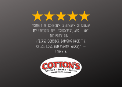 Why Diners Love Cotton’s Restaurant in Orange Beach: When you’re searching for the perfect dining experience on the Alabama Gulf Coast, Cotton’s Restaurant in Orange Beach is a top choice for both locals and visitors. From fresh Gulf seafood to juicy steaks and Southern favorites, Cotton’s has something for everyone. But don’t just take our word for it—hear it from our satisfied customers who keep coming back for more.